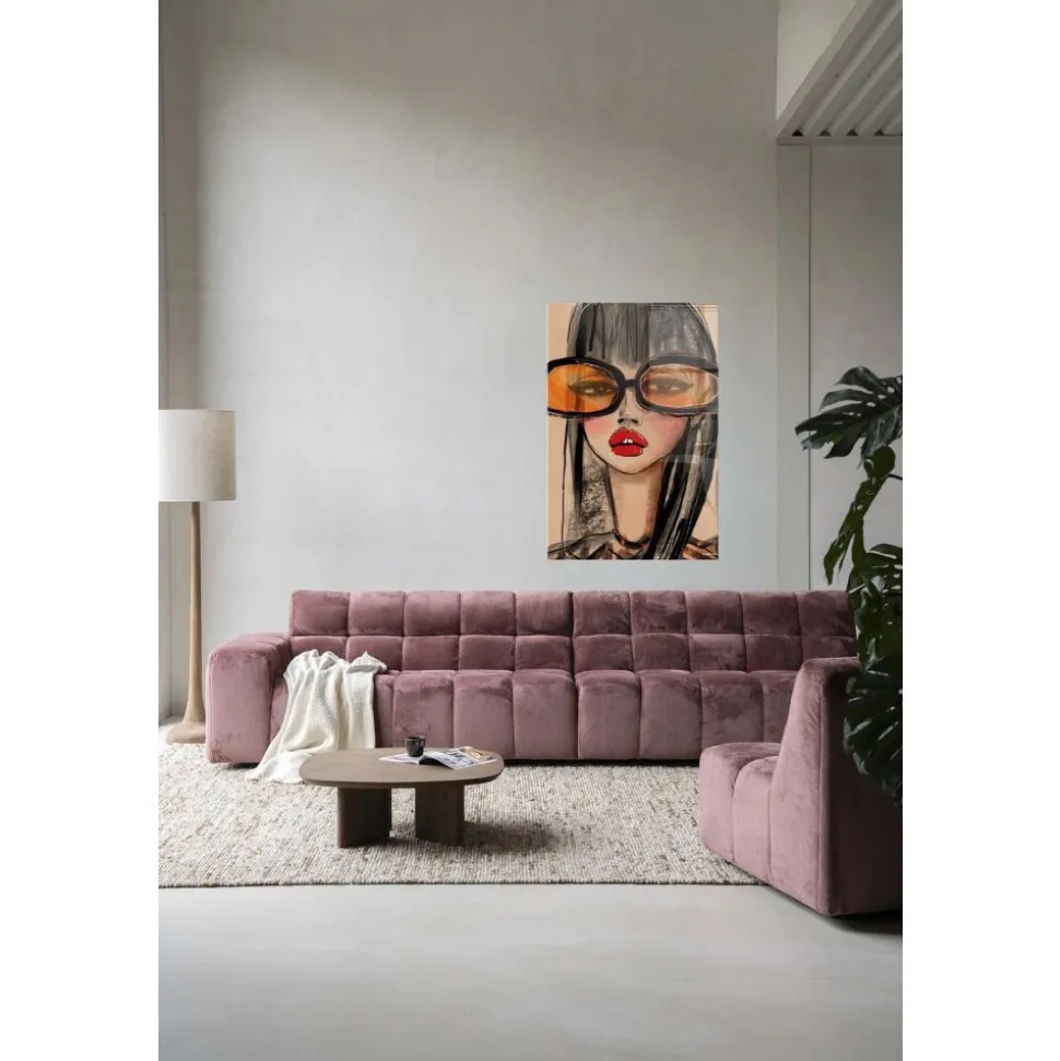 Een gedurfde illustratie van een vrouw met oranje accenten en levendige rode tinten. Dit moderne portret is een eyecatcher die uw interieur persoonlijkheid geeft. Uitgevoerd als glazen schilderij, wat zorgt voor een strakke uitstraling.