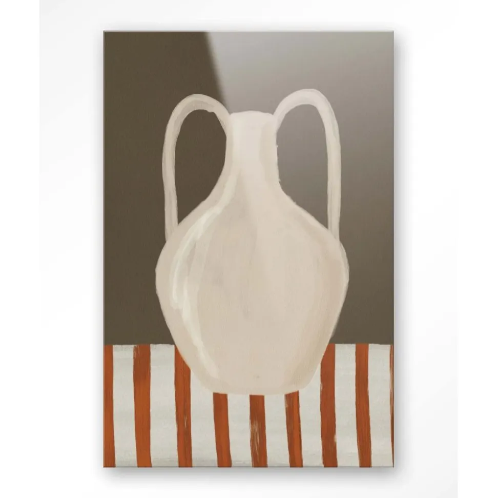 Deze elegante kunstprint toont een vaas in een zachte beige tint op een donkere achtergrond. De verfijnde lijnen en harmonieuze kleuren maken dit een tijdloze toevoeging aan elk interieur. Ideaal voor een stijlvolle wanddecoratie. Uitgevoerd als glazen schilderij, wat zorgt voor een strakke uitstraling..