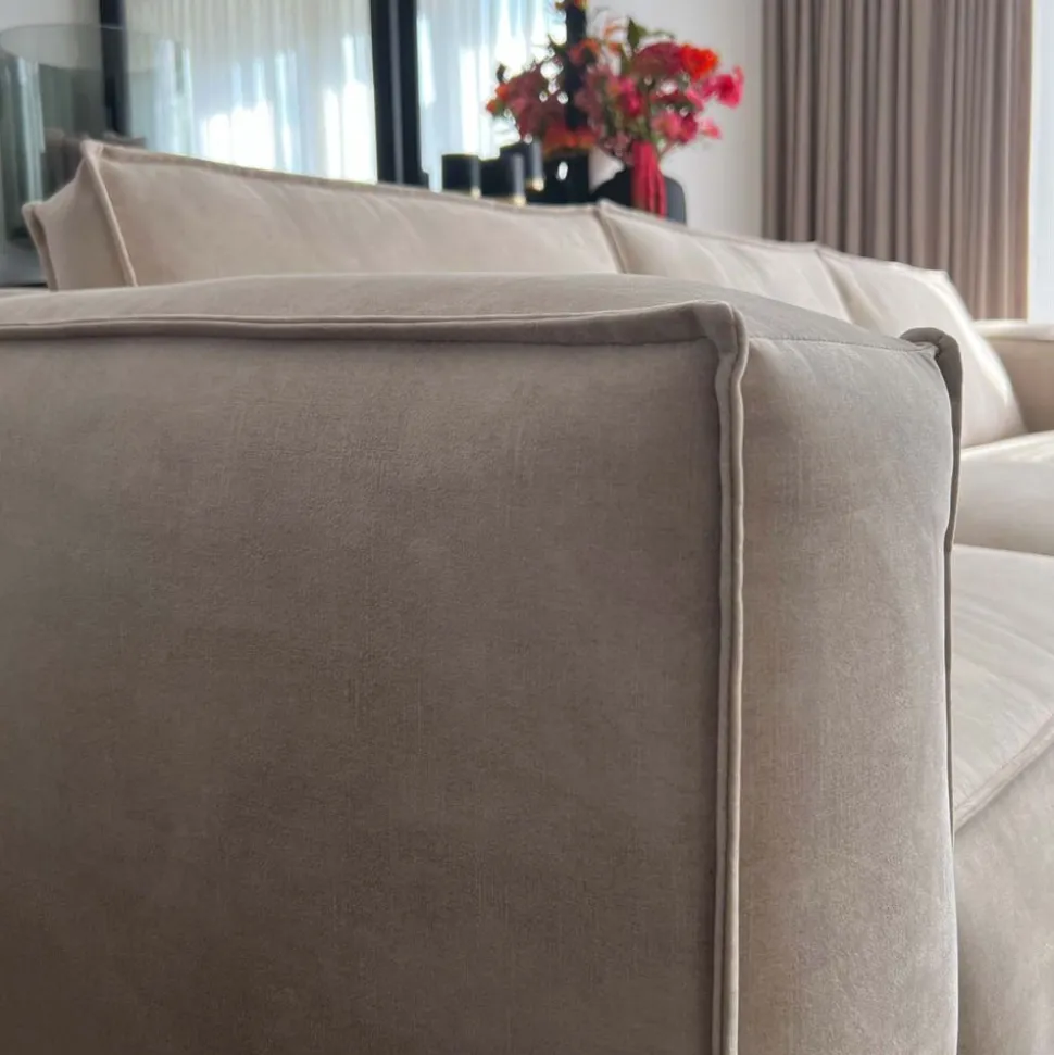Playa is een luxe loungebank met vaste zitkussens en los gestoffeerde rugkussens. De bank is voorzien van zwarte metalen pootjes en de armleuningen en rugkussens zijn voorzien van een dubbel gestikte bies wat de bank een stoere uitstraling geeft.