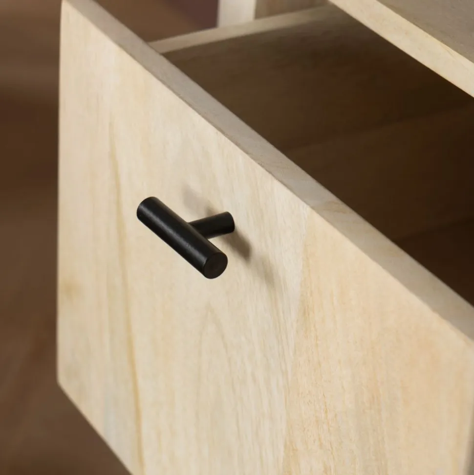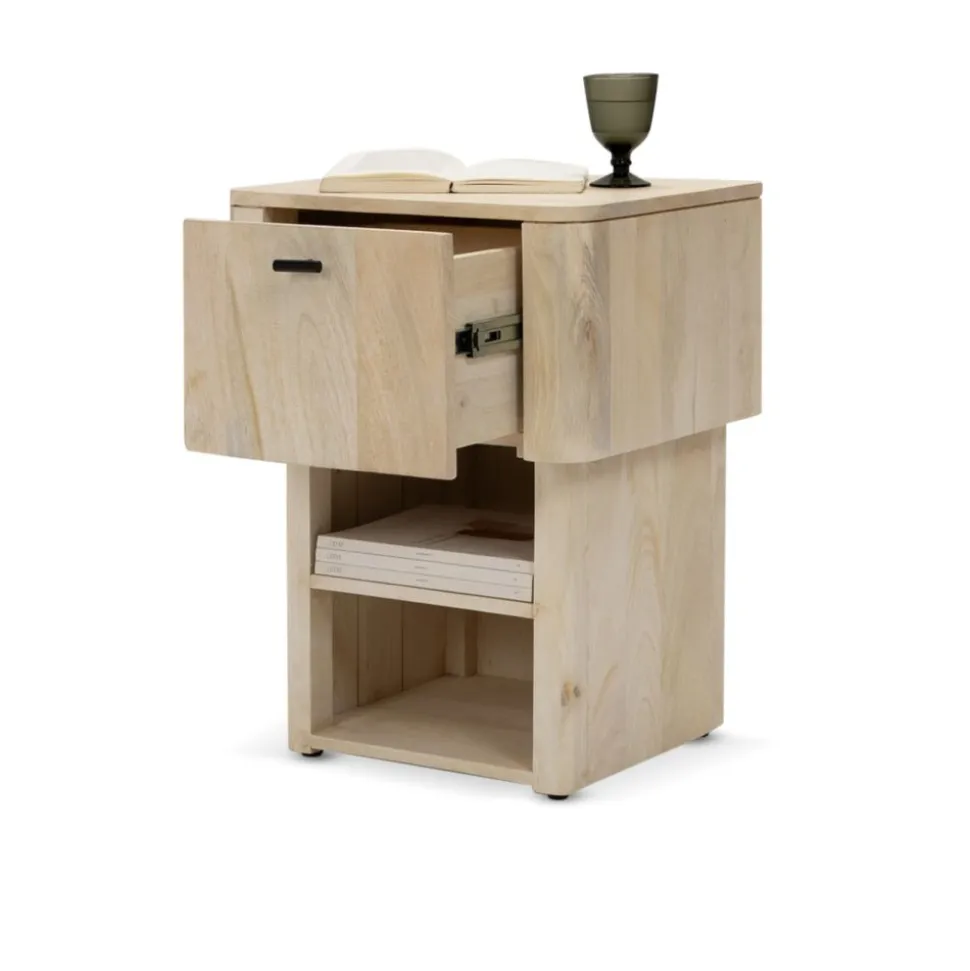 Het Sofia nachtkastje in naturel houtkleur combineert een strakke vormgeving met warme, natuurlijke tinten. Dankzij het minimalistische design en de mooie houtstructuur is dit nachtkastje een echte blikvanger in elke slaapkamer.