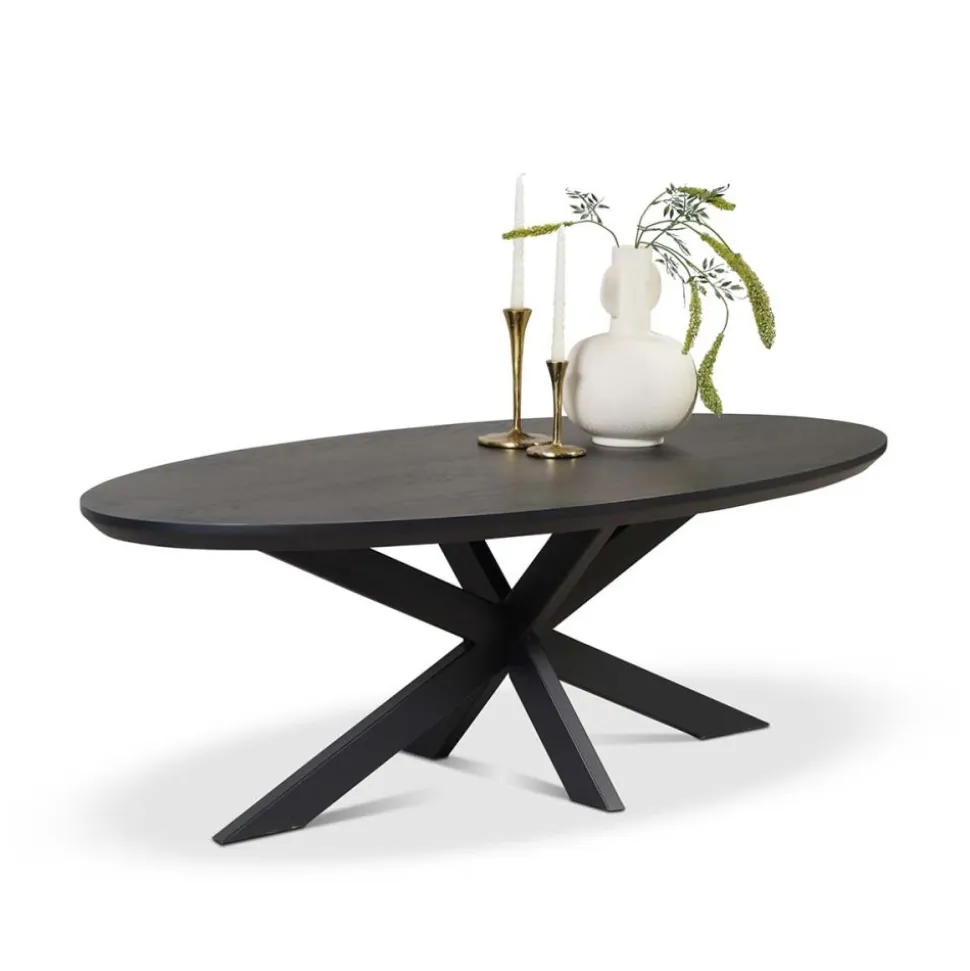 George is een trendy, ovale salontafel gemaakt van melamine. Het tafelblad is verjongd, heeft een gave, zwarte kleur en rust op een stoere, metalen spinpoot.