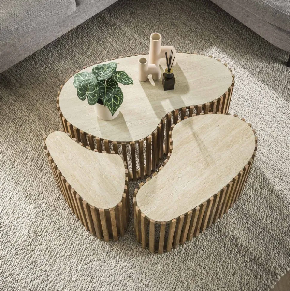 Salontafel set/3 niervorm Nuovo travertin / Massief mango zandkleur