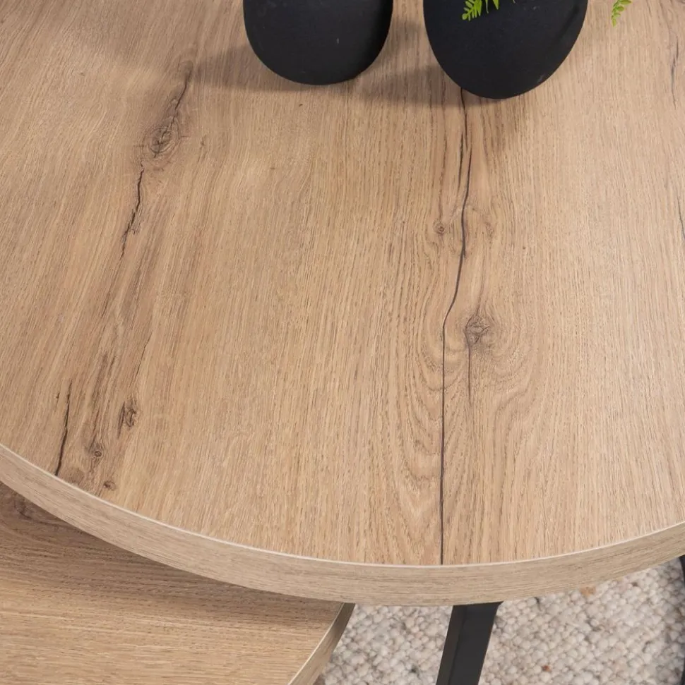 Lisa is een trendy, set ronde salontafels die zijn gemaakt van melamine. De set bestaat uit 3 ronde tafeltjes. De tafelbladen hebben een mooie, vlakke afwerking. Verkrijgbaar in vier trendy kleuren: authentiek eiken, mango, walnoot en zwart.
