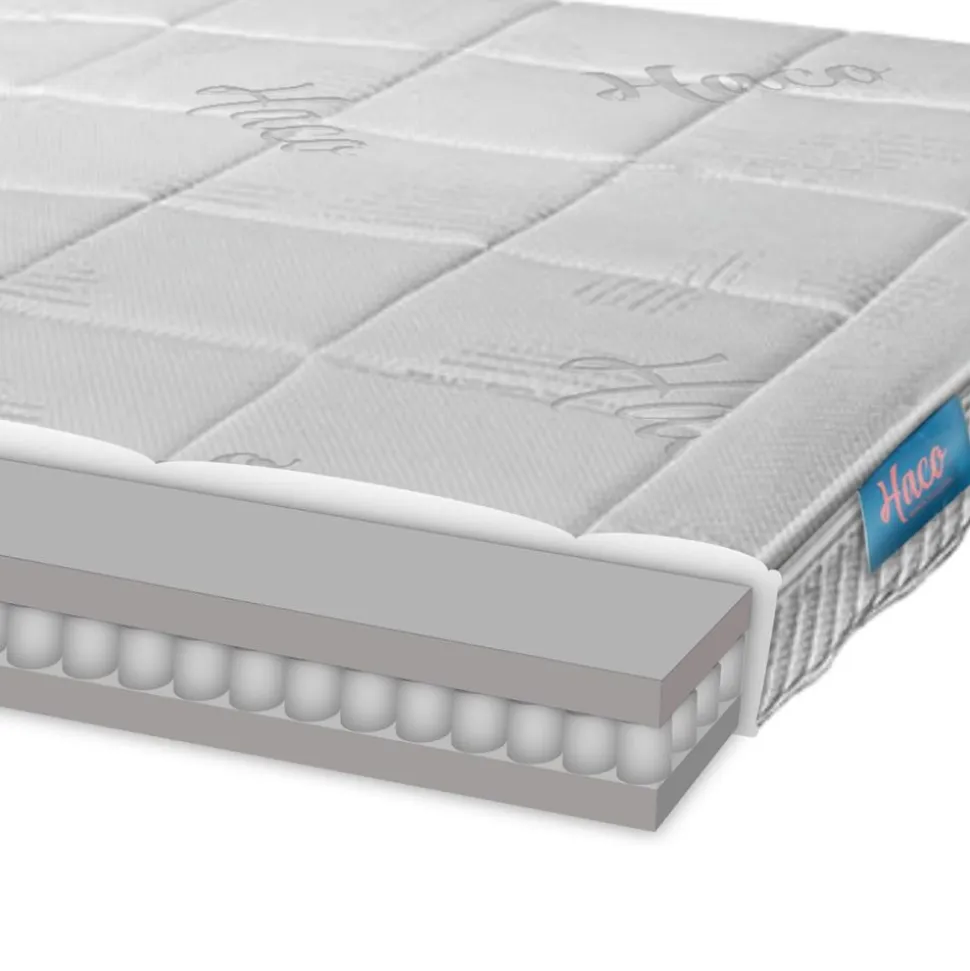 De Ariane Pocketvering Deluxe is een luxe topmatras van ca. 12 cm dik en biedt een steviger liggevoel met een zacht, comfortabel oppervlak. De kern bestaat uit 2,5 cm micropocketveren die zorgen voor een gelijkmatige drukverdeling en extra ondersteuning. Aan beide zijden is de kern omgeven door een comfortabele hybride schuimlaag, waardoor je prettig ligt zonder te diep weg te zakken.