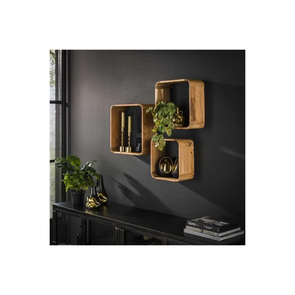 Wandschap set/3 vierkant / Massief acacia naturel
